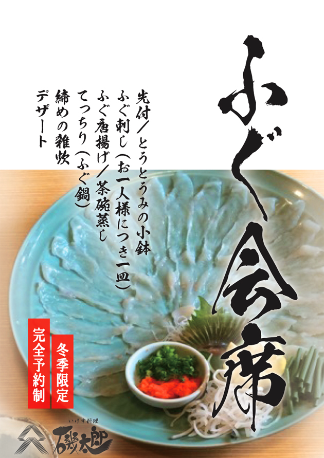 冬季限定、地元産ふぐをふんだんに使った「ふぐ会席」をご用意しています。ふぐ刺し・唐揚げ・てっちりなどの「ふぐづくし」。おひとり様 8,800円で、2名様より承り(時価/税込)。ご予約はお電話にて、3日前までにお願いいたします。(完全予約制)